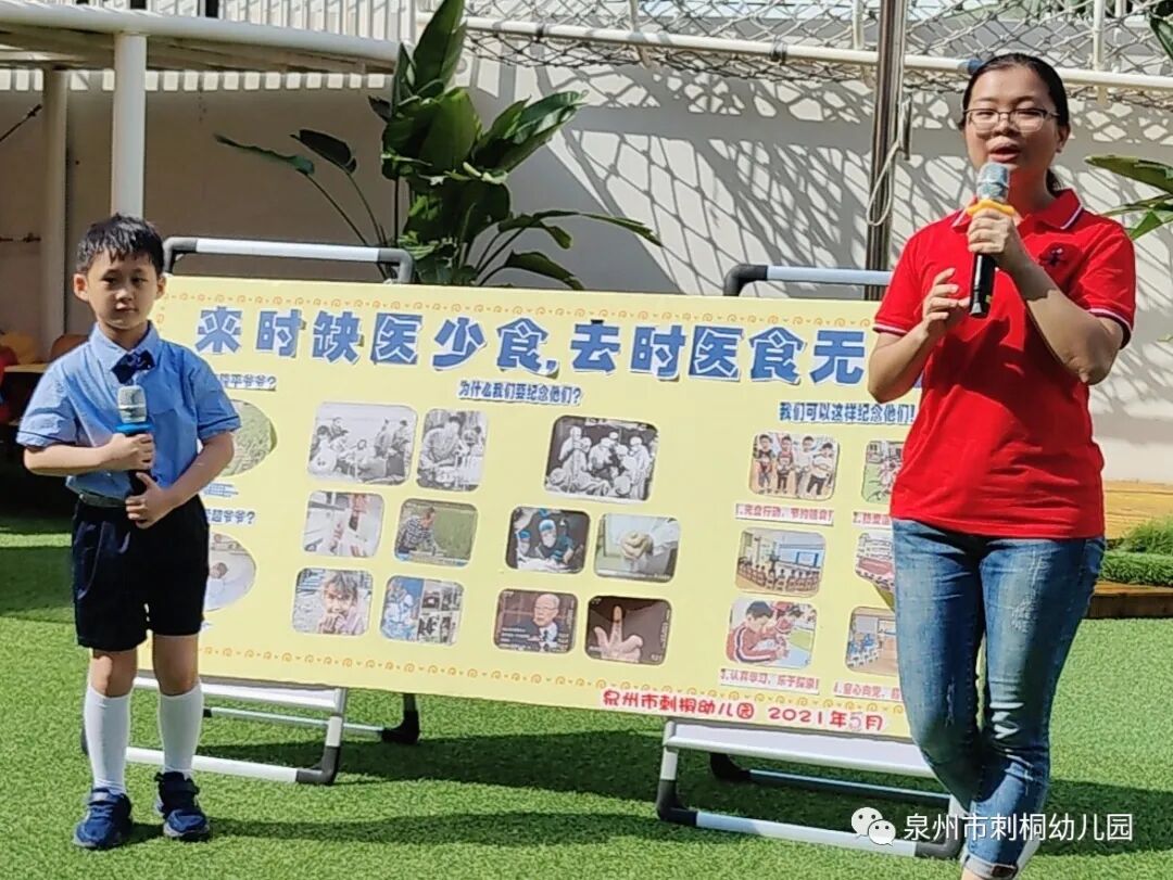 在全园升旗仪式中,黄慧君老师和黄烨棋小朋友通过图文并茂的展板、生动的亲子互动为全园的幼儿介绍了“谁是袁隆平爷爷、谁是吴孟超爷爷?”“为什么要纪念他们?”“我们应该怎么向他们学习?”